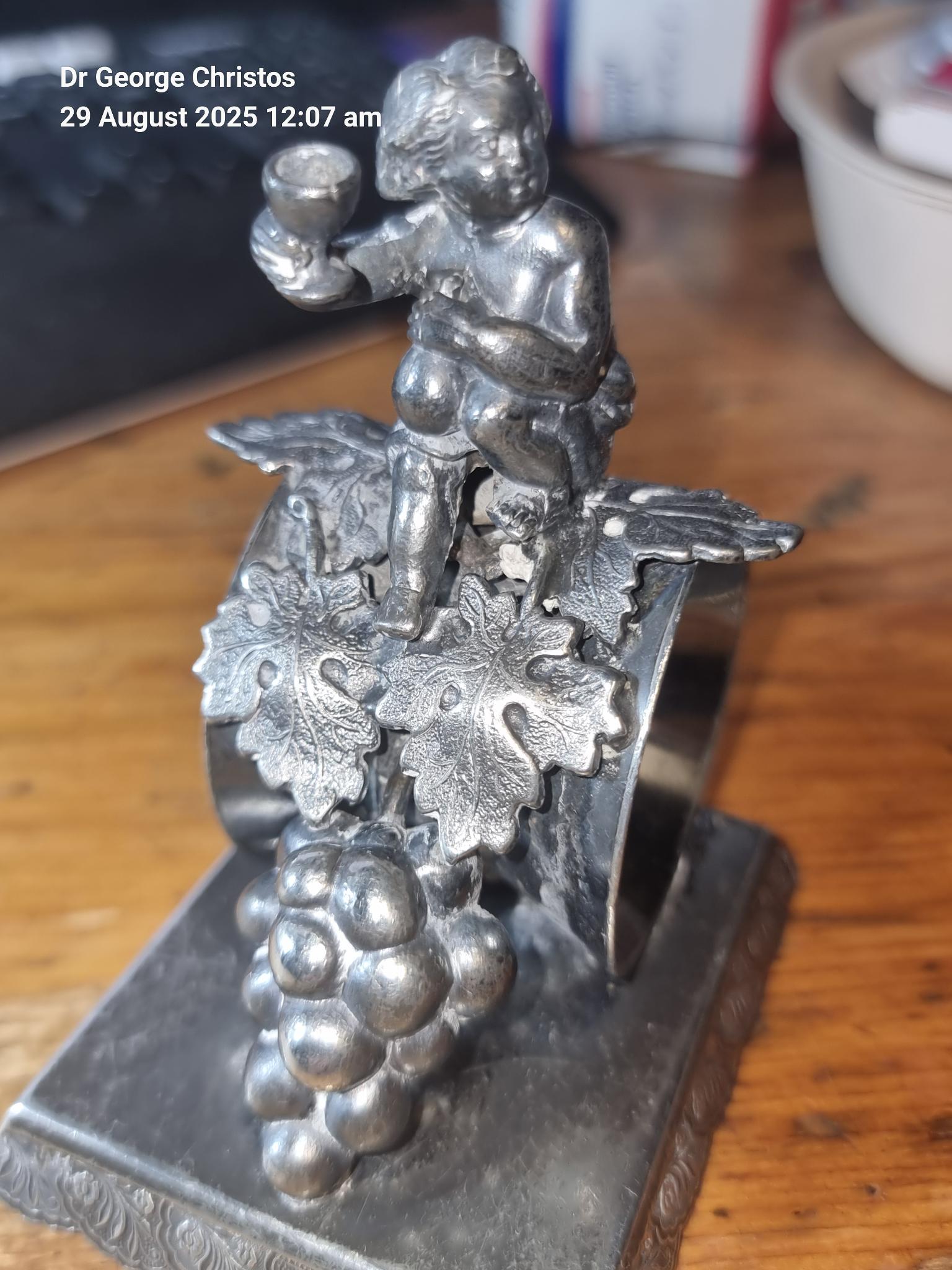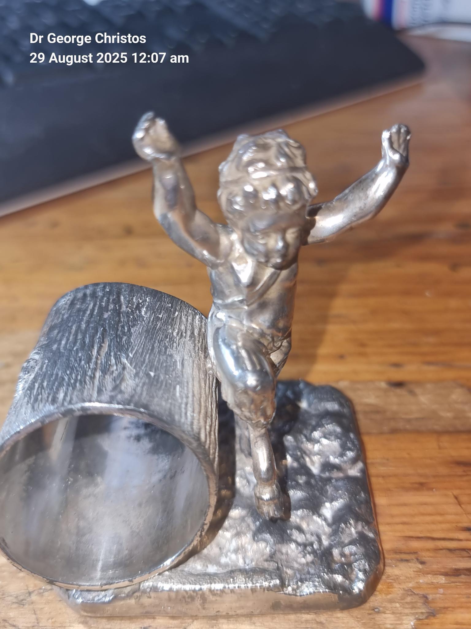 In this figural napkin ring a cherub is reaching behind for arrows on knifes. Unmarked as far as I can tell.