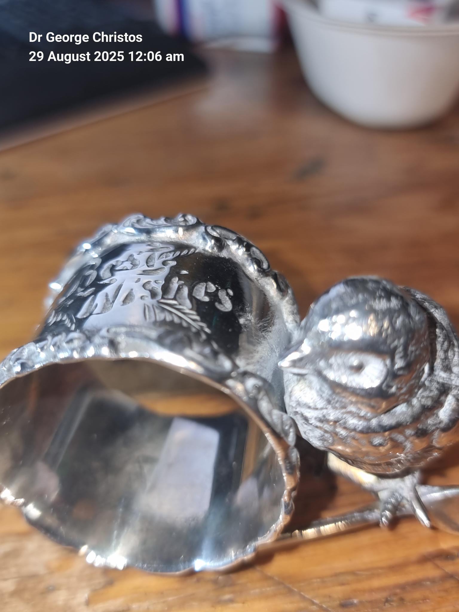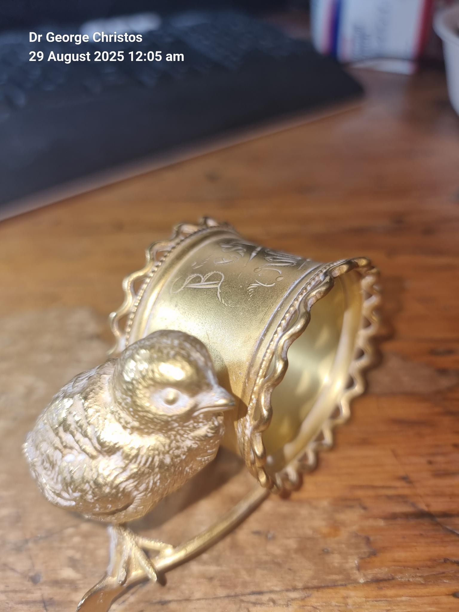This a fabulous and very rare figural napkin ring with a chick in front of a music sheet,