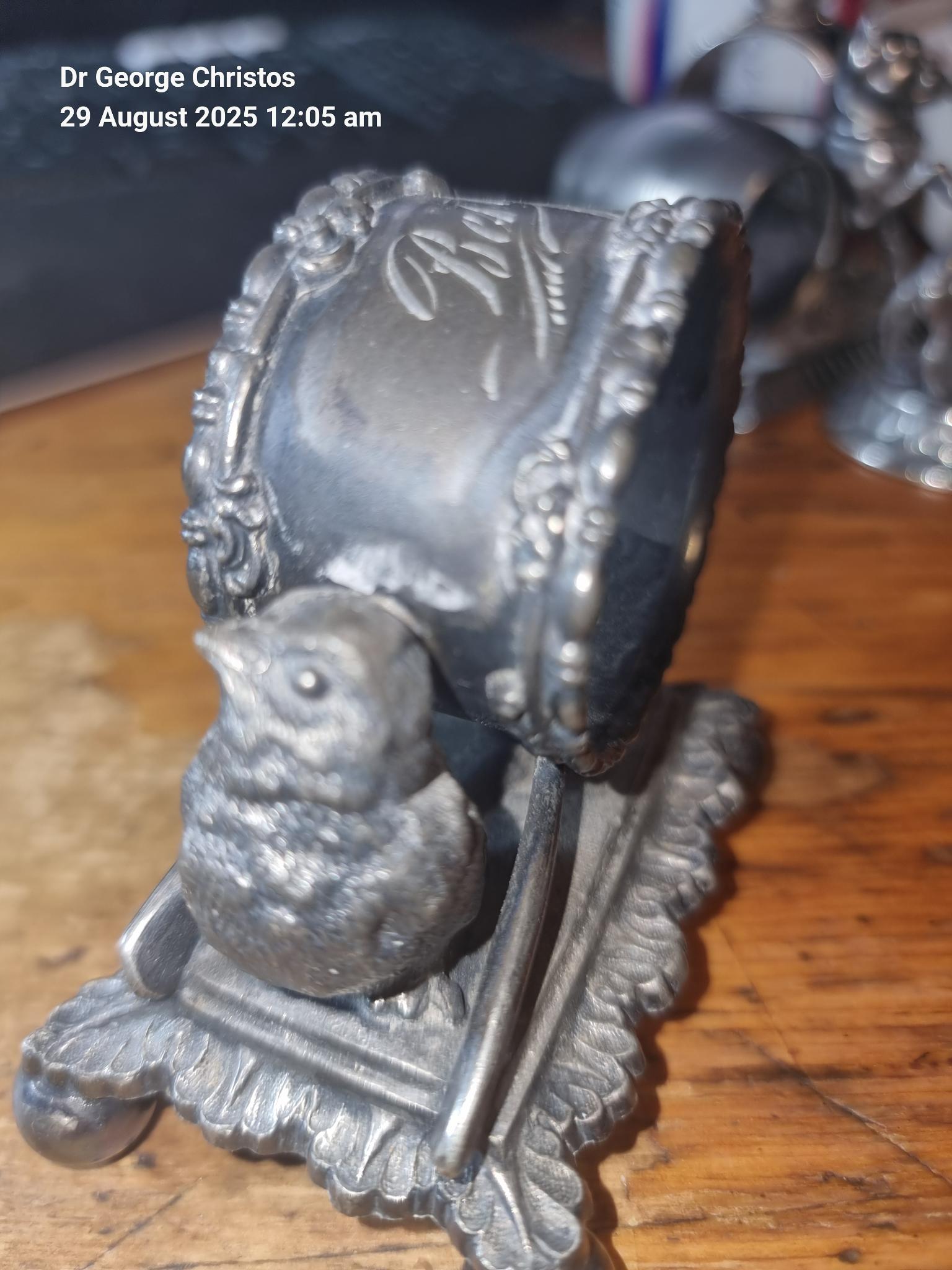a chick stands on a circular base next to a napkin ring. Marked Van