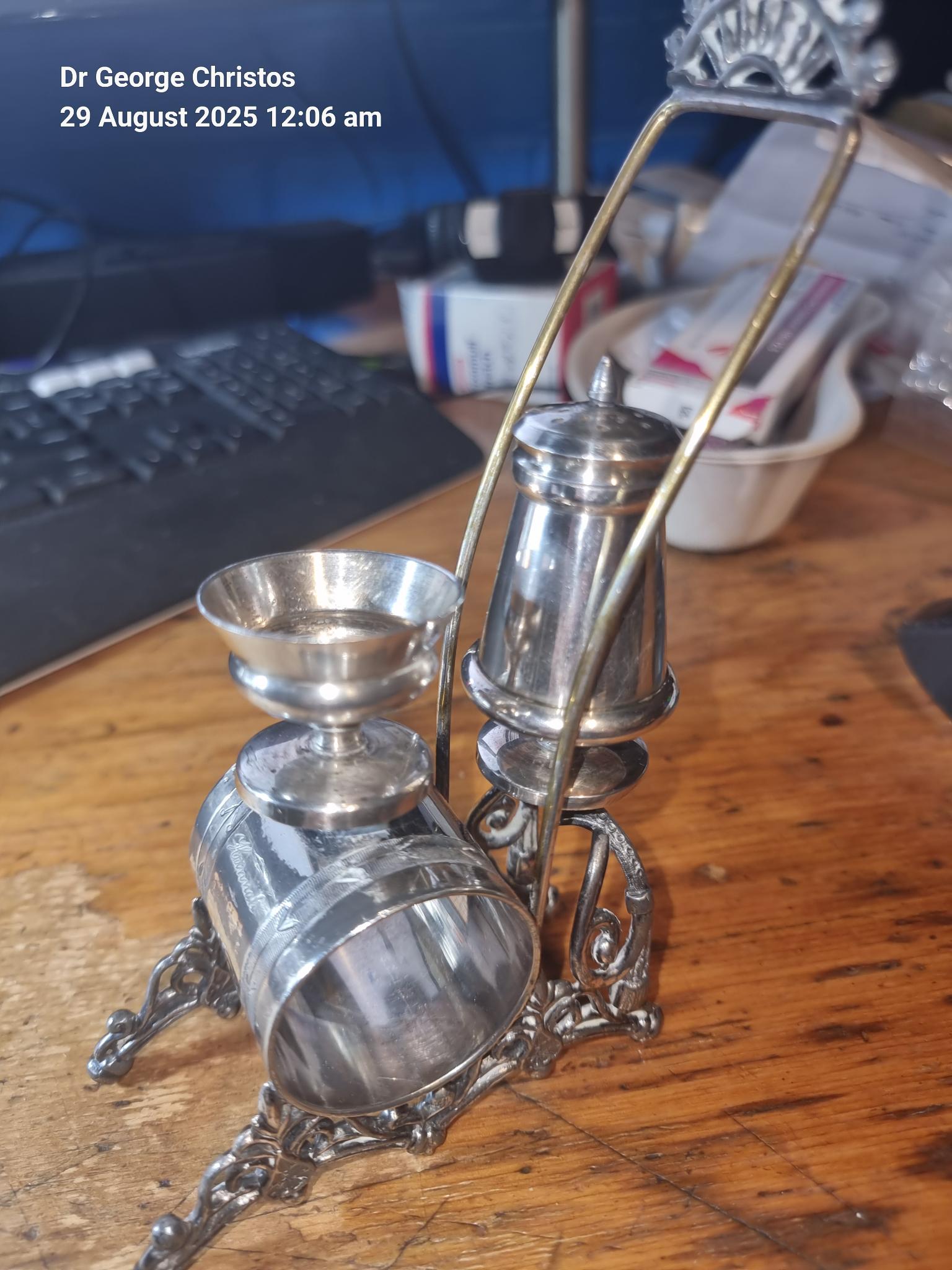 handle scrolls salt bowl, pepper pot and a vinigar bottle.