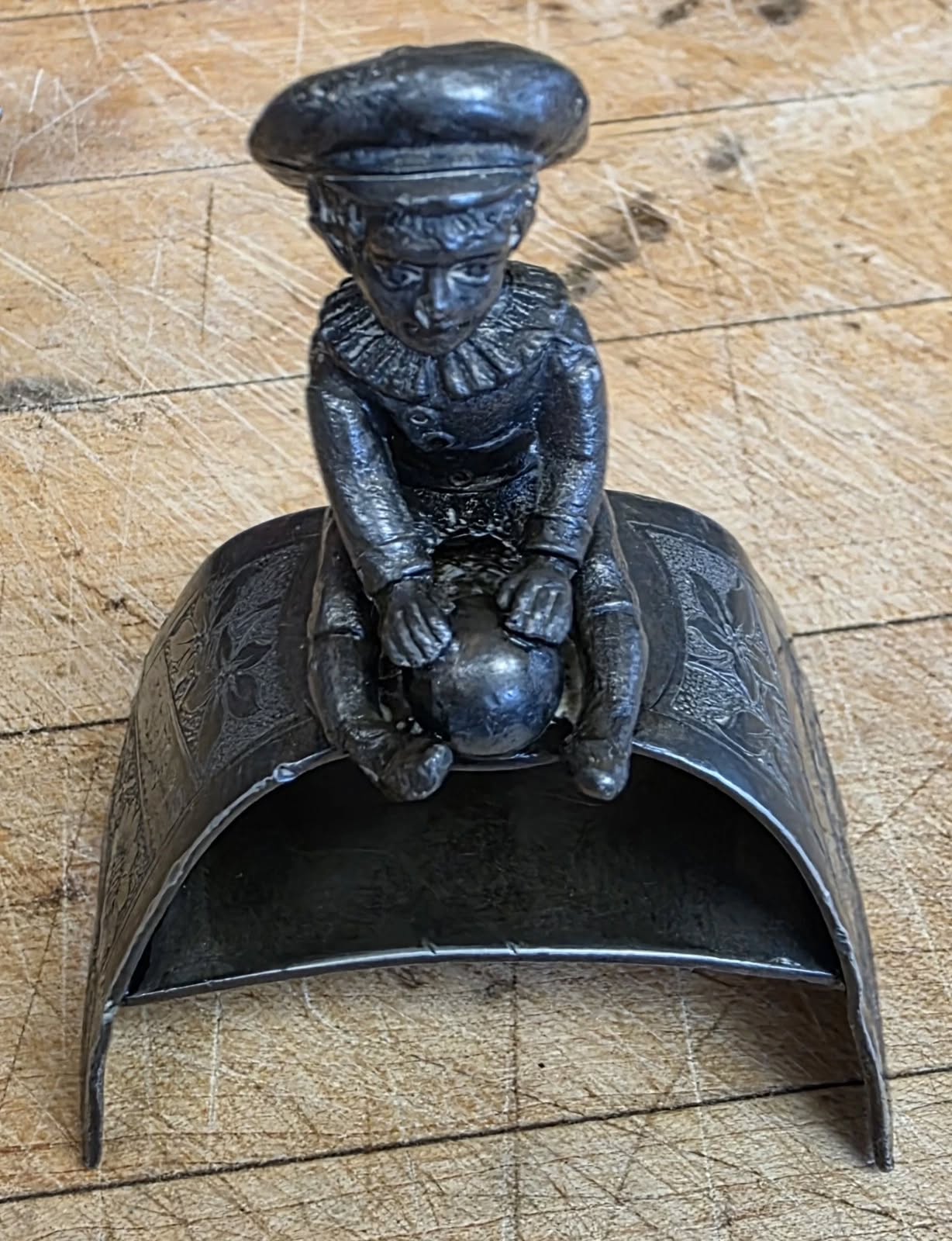This figural napkin ring has what appears to be a sailor or pioneer waving his hat.