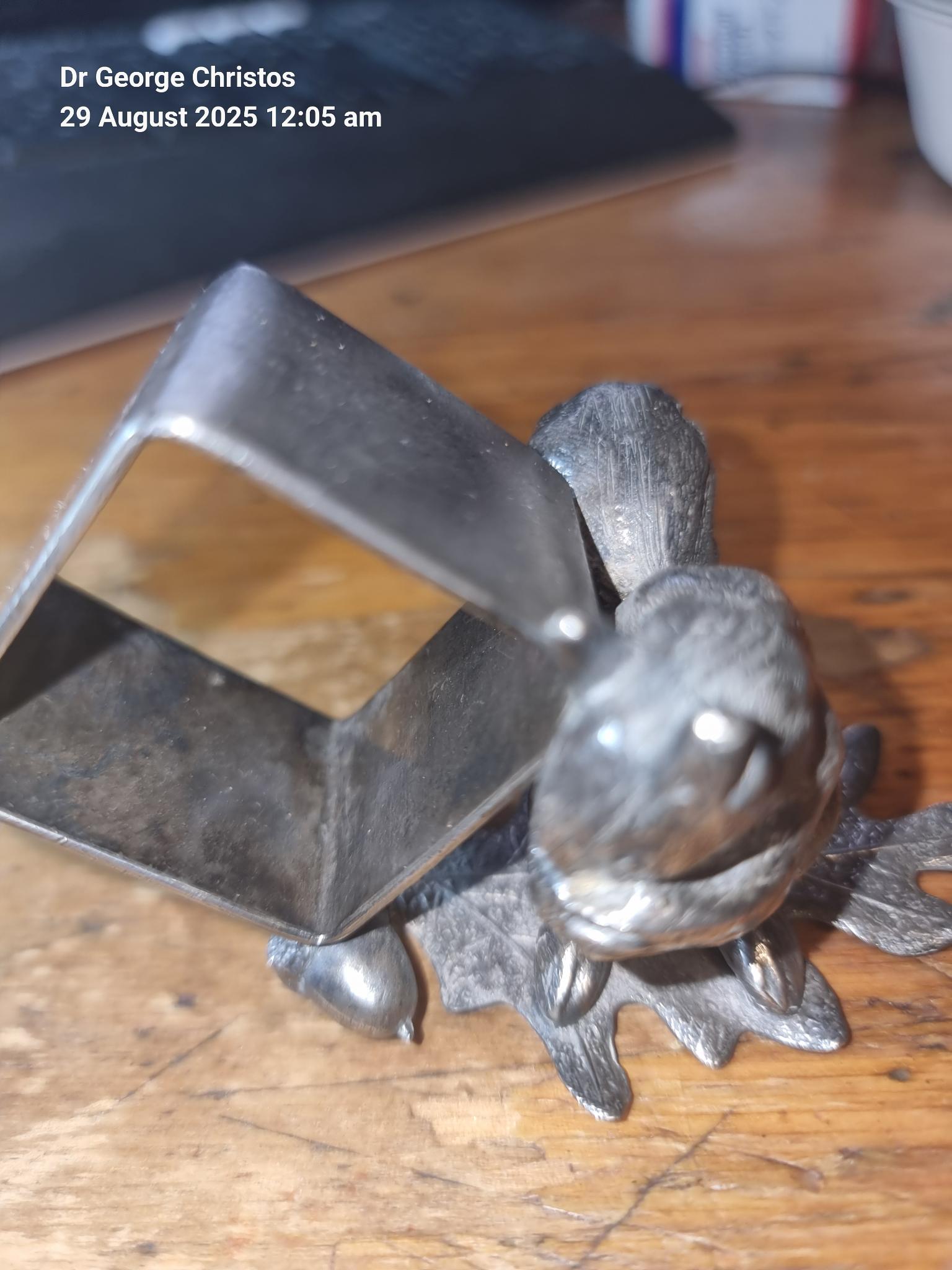 This figural napkin ring is NOT shown in the book by Gottschalk and Whitson's book "Figural napkin Rings: Collectors Identification and Value Guild", so is very rare.