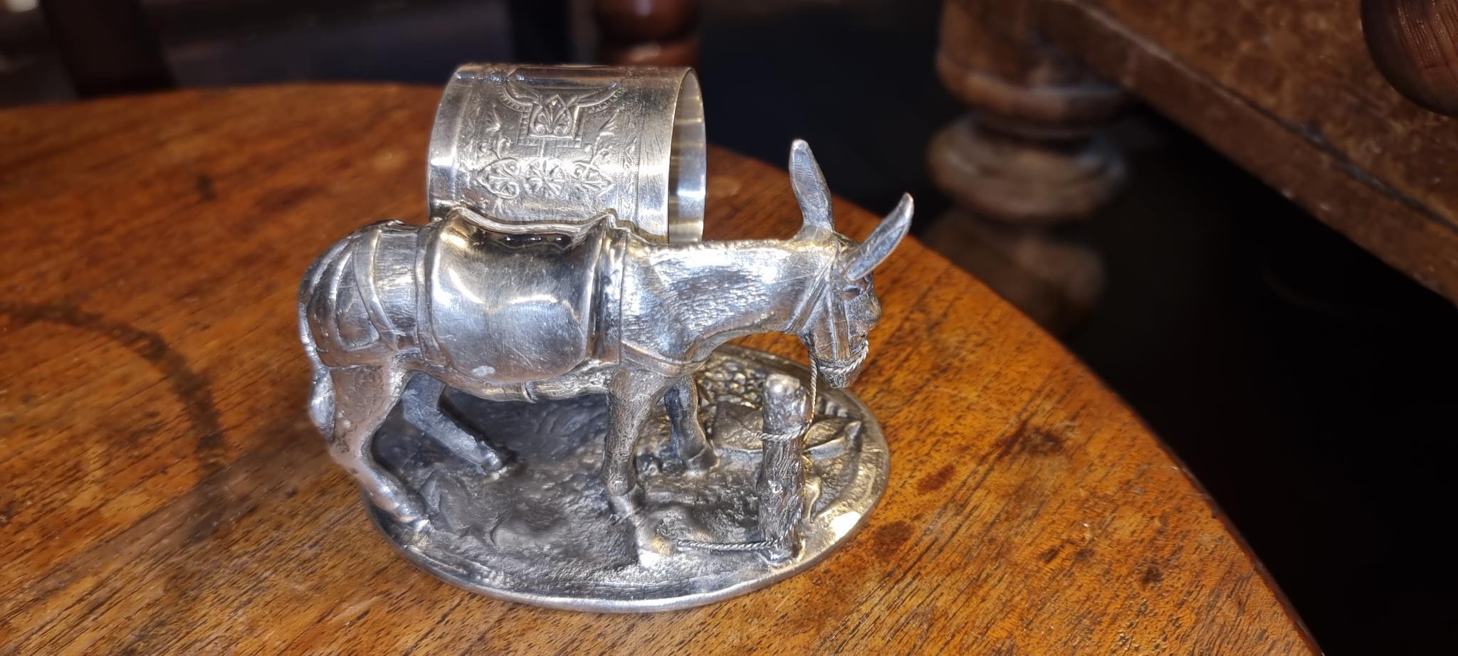 This figural napkin ring has a donkey or mule next to a