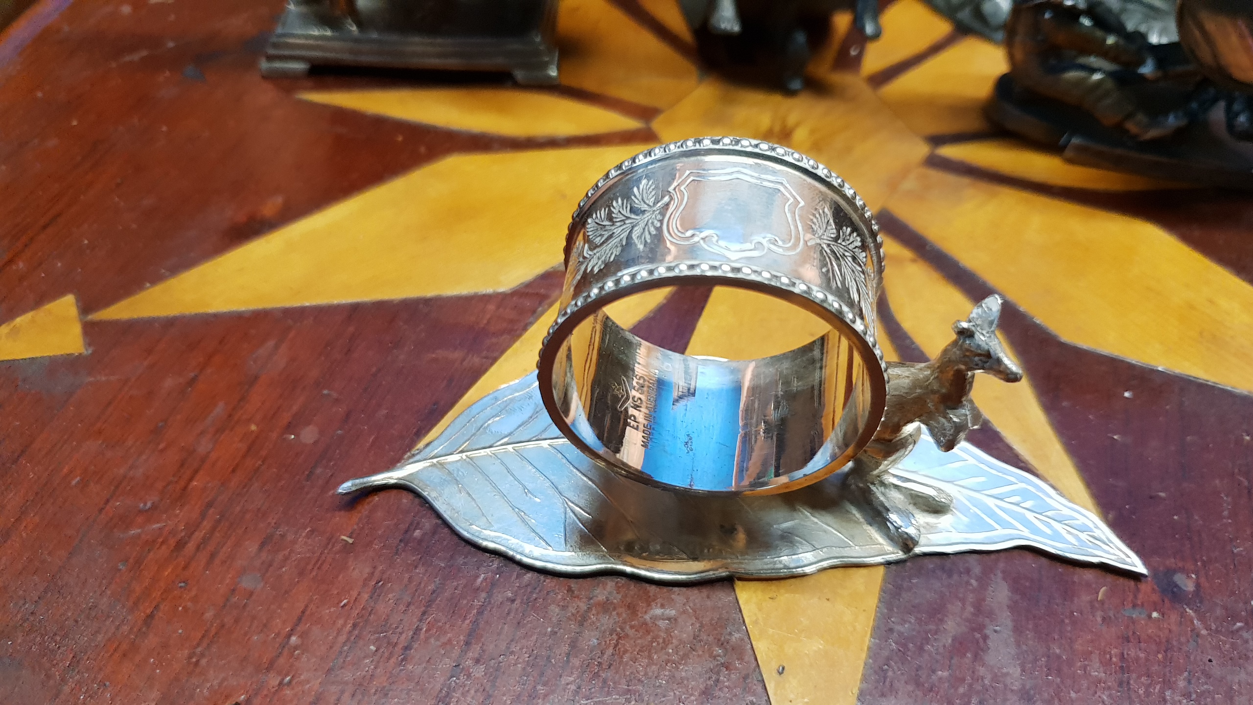 Australian napkin ring on leaf base with emu, marked EPNS S&S