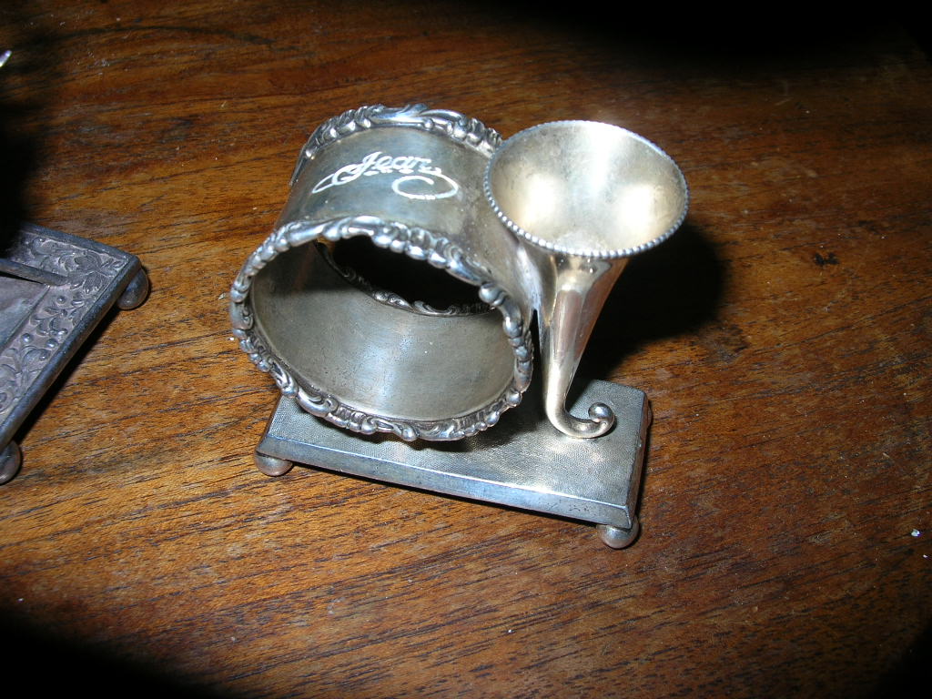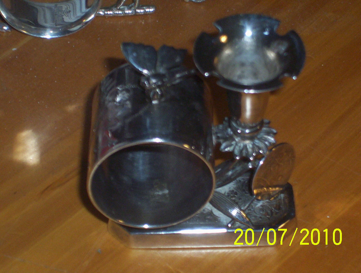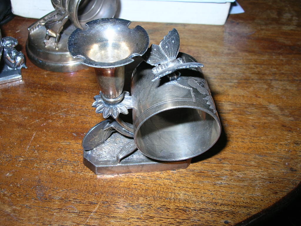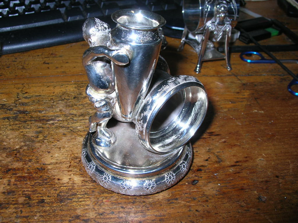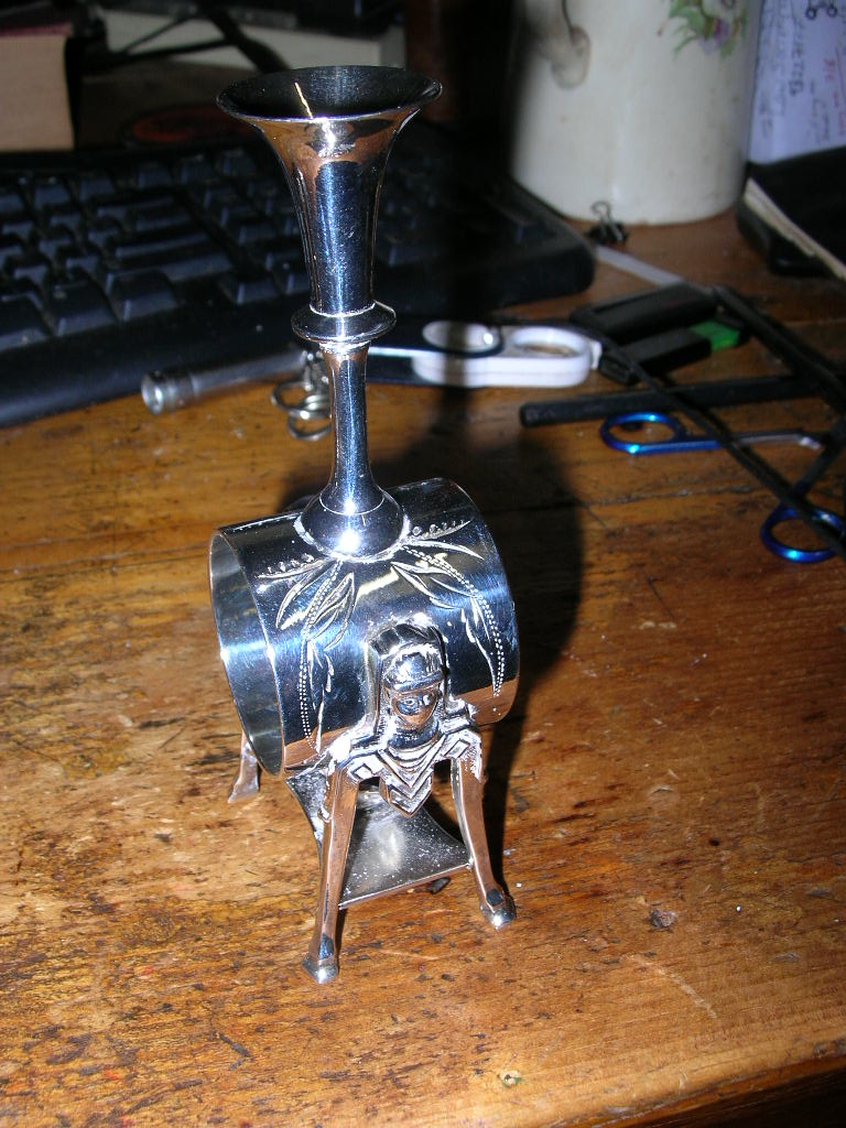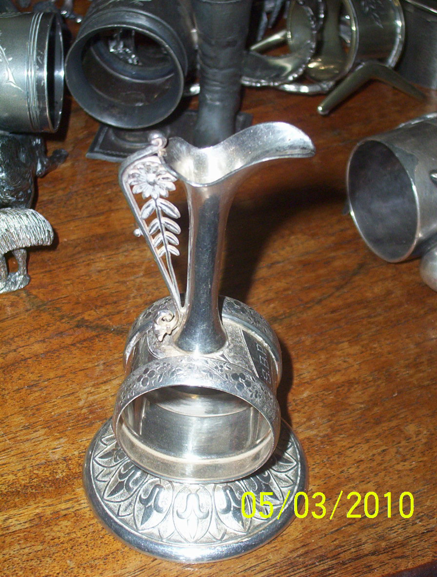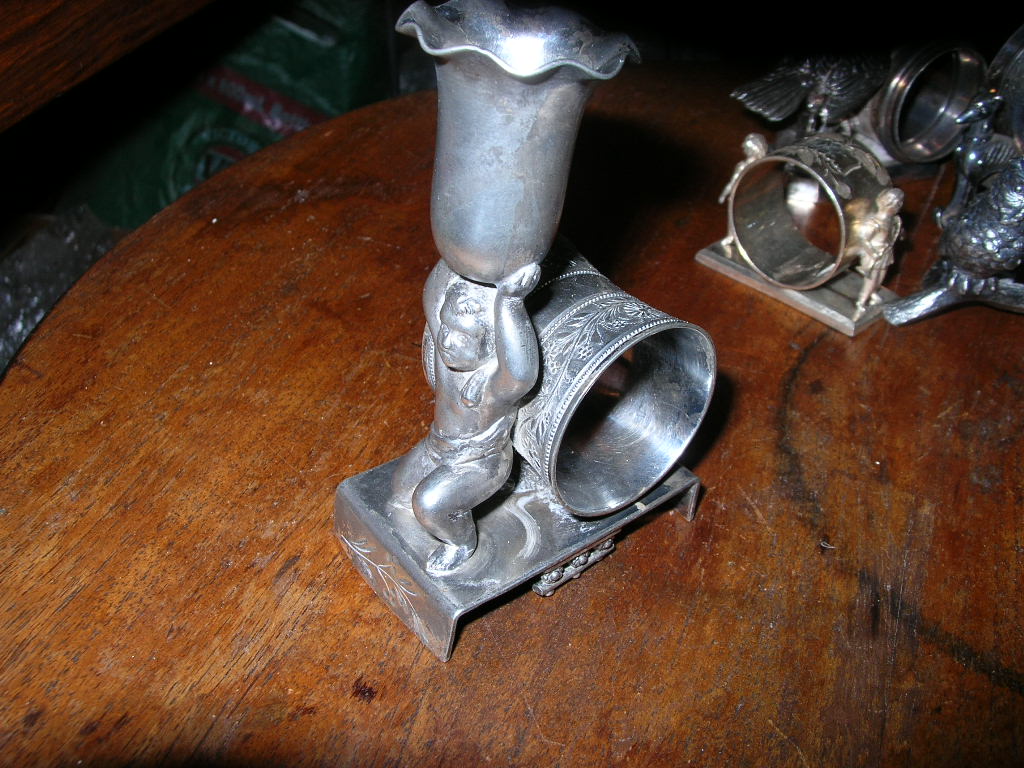 is a magnificent figural napkin ring with a bud vase. It an unusual
