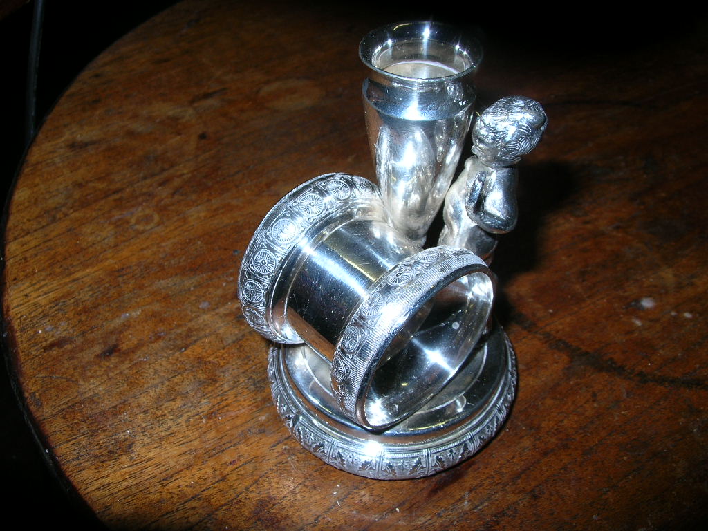 2 x In this napkin ring, a female cherub-like figure (or maybe just a nude lady) holds onto the bud vase,