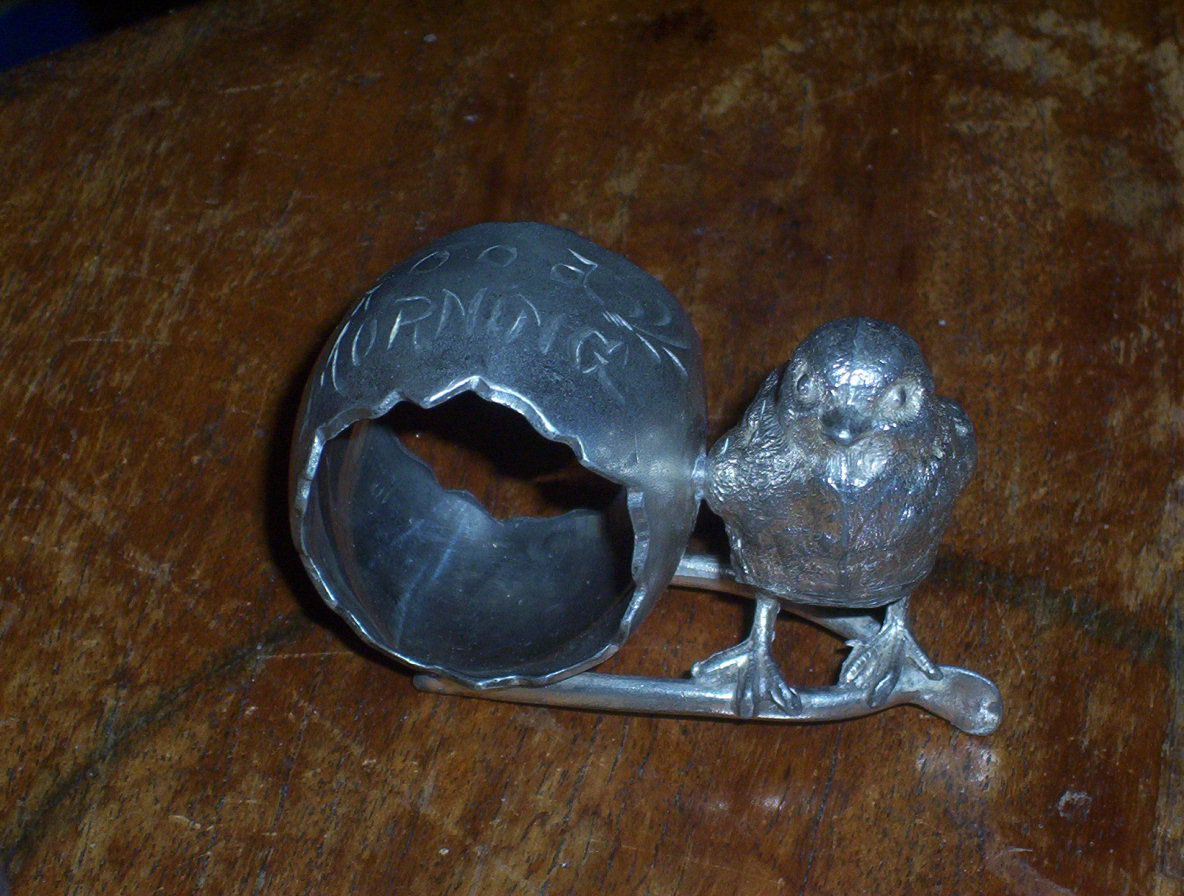 a most unusual chick and wishbone napkin ring in a base