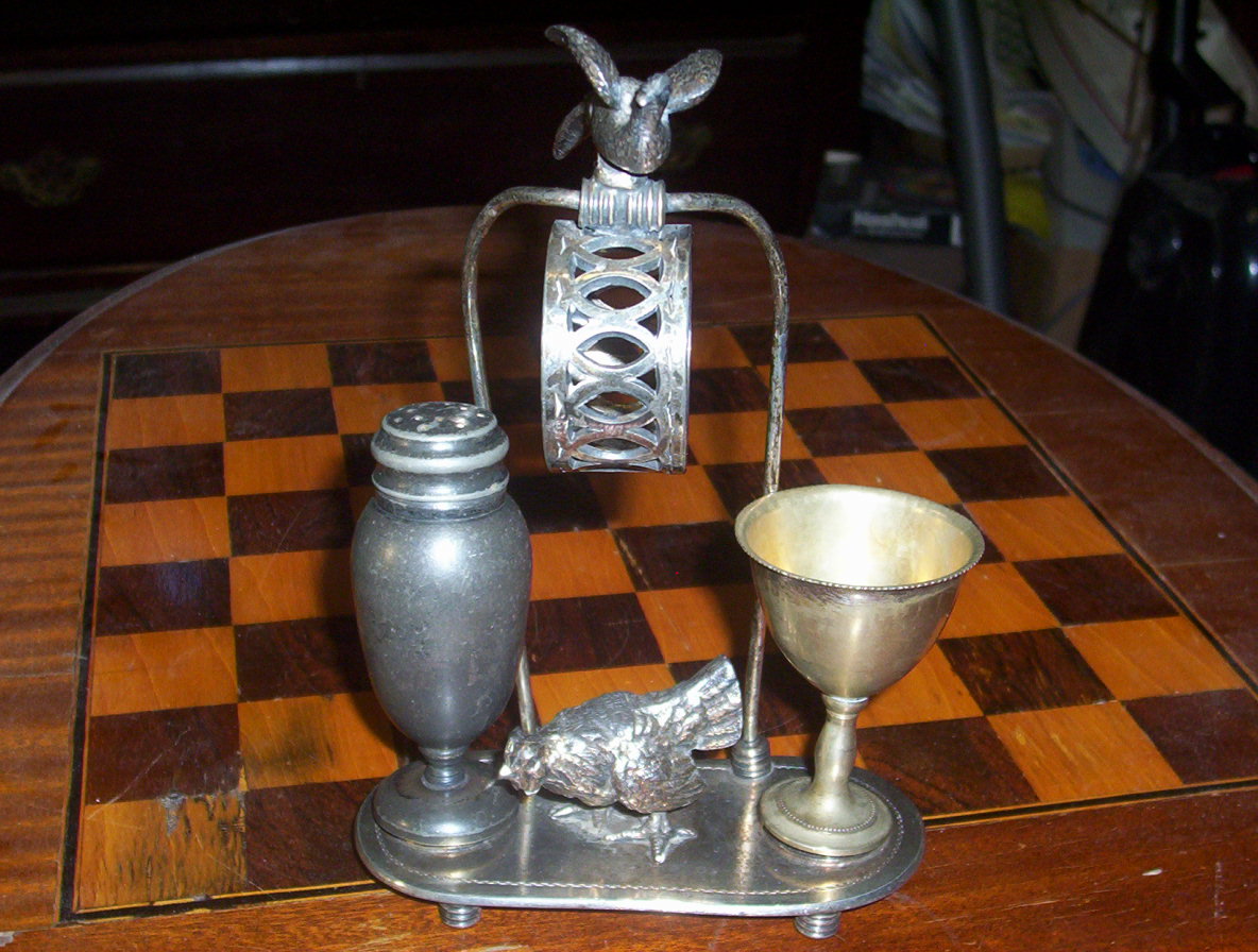 a broken egg which forms the salt. The napkin holder sits behind and