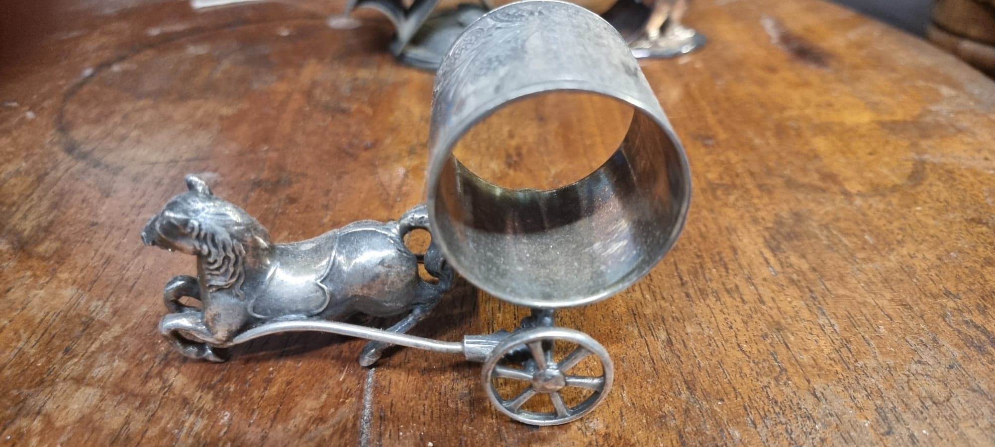 This figural napkin ring has a rather large horse pulling the ring like it is a cart.