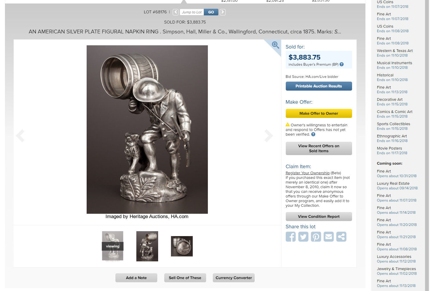 This figural napkin ring is made by WMF. They made figurals as good as the American ones.